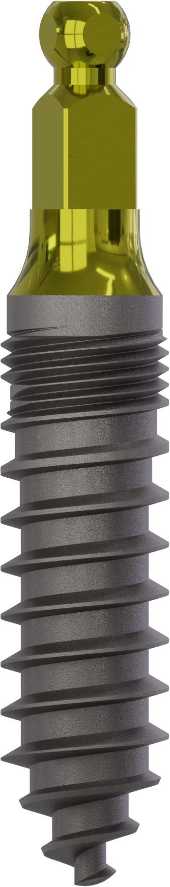 Das Champions Kugelkopf-Implantat ist ein 1-teiliges Schraubimplantat, das auf Knochenniveau zu inserieren ist. Es stehen Implantate in den Durchmessern 2,5/3,0/4,0 und Längen von 8/10/12/14/16 mm zur Verfügung. Hierdurch ist ein weit gefächertes Indikationsspektrum gegeben. Das Implantat eignet sich nicht nur zur Insertion in den bereits langzeitig abgeheilten Kieferknochen (Spätimplantation), sondern auch zur verzögerten Insertion(6 – 8 Wochen nach Zahnextraktion) sowie unter entsprechenden Bedingungen zur Sofortimplantation (direkt nach Zahnextraktion). Kugelkopf-Implantate können in allen Knochenqualitäten des Ober- und Unterkiefers (D1–D4) zur Fixierung von herausnehmbarem Zahnersatz eingesetzt werden. Im Oberkiefer mindestens drei Pfeiler pro Quadrant, im Unterkiefer mindestens zwei Pfeiler pro Quadrant. Beachten Sie bitte die Indikationseinschränkungen in der Gebrauchsanleitung. Material: Titan Grad 4 (KV)