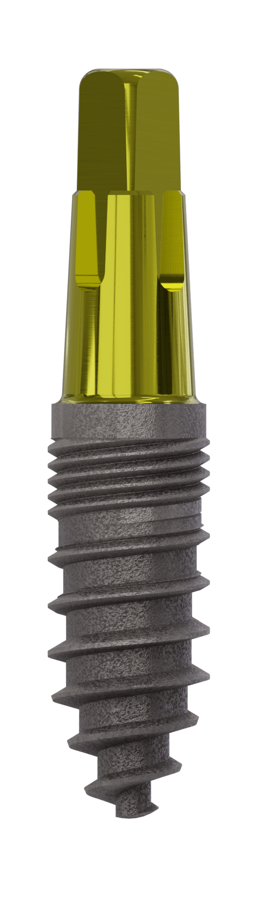 Vierkant-Implantat New Art | ø 4,0 mm | Länge 10,0 mm. Das Champions Vierkant-Implantat ist ein enossales, rotationssymetrisches Implantat aus Titan Grad 4 (KV). Es kann in allen Knochenqualitäten des Ober- und Unterkiefers (D1–D4) mit und ohne Augmentation eingesetzt werden. Durch unterschiedliche Durchmesser und Längen ist ein weit gefächertes Indikationsspektrum gegeben. Sie eignen sich zur Insertion in den bereits langzeitig abgeheilten Kieferknochen (Spätimplantation), zur verzögerten Insertion (6–8 Wochen nach Zahnextraktion) und zur Sofortimplantation (direkt nach Zahnextraktion – unter entsprechenden Bedingungen). Beachten Sie bitte die Indikationseinschränkungen in der jeweiligen Gebrauchsanleitung. Material: Titan Grad 4 (KV)