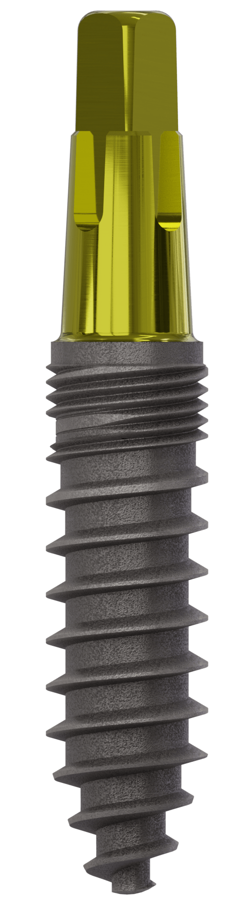 Vierkant-Implantat New Art | ø 4,0 mm | Länge 14,0 mm. Das Champions Vierkant-Implantat ist ein enossales, rotationssymetrisches Implantat aus Titan Grad 4 (KV). Es kann in allen Knochenqualitäten des Ober- und Unterkiefers (D1–D4) mit und ohne Augmentation eingesetzt werden. Durch unterschiedliche Durchmesser und Längen ist ein weit gefächertes Indikationsspektrum gegeben. Sie eignen sich zur Insertion in den bereits langzeitig abgeheilten Kieferknochen (Spätimplantation), zur verzögerten Insertion (6–8 Wochen nach Zahnextraktion) und zur Sofortimplantation (direkt nach Zahnextraktion – unter entsprechenden Bedingungen). Beachten Sie bitte die Indikationseinschränkungen in der jeweiligen Gebrauchsanleitung. Material: Titan Grad 4 (KV)