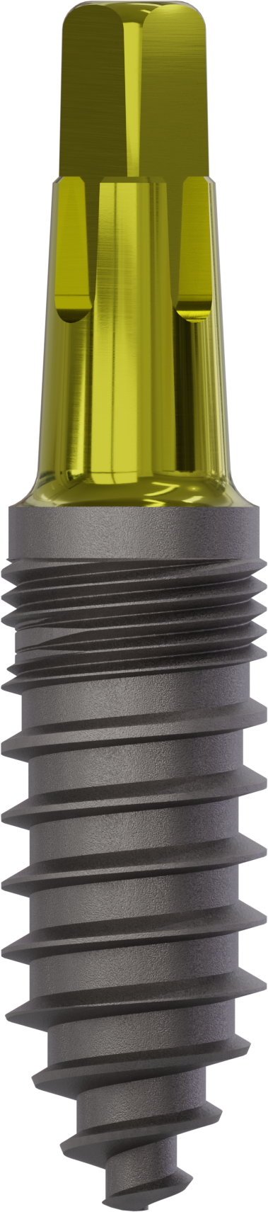 Vierkant-Implantat New Art | ø 4,5 mm | Länge 12,0 mm. Das Champions Vierkant-Implantat ist ein enossales, rotationssymetrisches Implantat aus Titan Grad 4 (KV). Es kann in allen Knochenqualitäten des Ober- und Unterkiefers (D1–D4) mit und ohne Augmentation eingesetzt werden. Durch unterschiedliche Durchmesser und Längen ist ein weit gefächertes Indikationsspektrum gegeben. Sie eignen sich zur Insertion in den bereits langzeitig abgeheilten Kieferknochen (Spätimplantation), zur verzögerten Insertion (6–8 Wochen nach Zahnextraktion) und zur Sofortimplantation (direkt nach Zahnextraktion – unter entsprechenden Bedingungen). Beachten Sie bitte die Indikationseinschränkungen in der jeweiligen Gebrauchsanleitung. Material: Titan Grad 4 (KV)