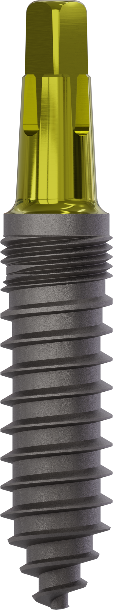Vierkant-Implantat New Art | ø 4,5 mm | Länge 16,0 mm. Das Champions Vierkant-Implantat ist ein enossales, rotationssymetrisches Implantat aus Titan Grad 4 (KV). Es kann in allen Knochenqualitäten des Ober- und Unterkiefers (D1–D4) mit und ohne Augmentation eingesetzt werden. Durch unterschiedliche Durchmesser und Längen ist ein weit gefächertes Indikationsspektrum gegeben. Sie eignen sich zur Insertion in den bereits langzeitig abgeheilten Kieferknochen (Spätimplantation), zur verzögerten Insertion (6–8 Wochen nach Zahnextraktion) und zur Sofortimplantation (direkt nach Zahnextraktion – unter entsprechenden Bedingungen). Beachten Sie bitte die Indikationseinschränkungen in der jeweiligen Gebrauchsanleitung. Material: Titan Grad 4 (KV)