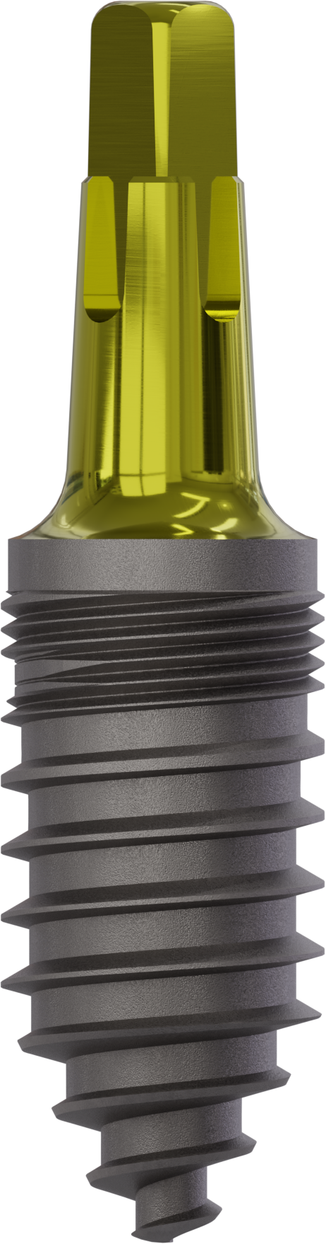 Vierkant-Implantat New Art | ø 5,5 mm | Länge 12,0 mm. Das Champions Vierkant-Implantat ist ein enossales, rotationssymetrisches Implantat aus Titan Grad 4 (KV). Es kann in allen Knochenqualitäten des Ober- und Unterkiefers (D1–D4) mit und ohne Augmentation eingesetzt werden. Durch unterschiedliche Durchmesser und Längen ist ein weit gefächertes Indikationsspektrum gegeben. Sie eignen sich zur Insertion in den bereits langzeitig abgeheilten Kieferknochen (Spätimplantation), zur verzögerten Insertion (6–8 Wochen nach Zahnextraktion) und zur Sofortimplantation (direkt nach Zahnextraktion – unter entsprechenden Bedingungen). Beachten Sie bitte die Indikationseinschränkungen in der jeweiligen Gebrauchsanleitung. Material: Titan Grad 4 (KV)