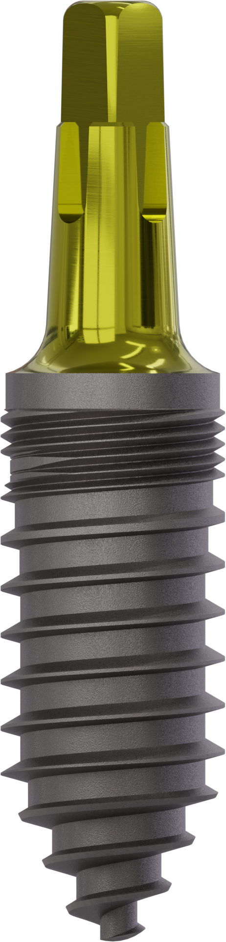 Vierkant-Implantat New Art | ø 5,5 mm | Länge 14,0 mm. Das Champions Vierkant-Implantat ist ein enossales, rotationssymetrisches Implantat aus Titan Grad 4 (KV). Es kann in allen Knochenqualitäten des Ober- und Unterkiefers (D1–D4) mit und ohne Augmentation eingesetzt werden. Durch unterschiedliche Durchmesser und Längen ist ein weit gefächertes Indikationsspektrum gegeben. Sie eignen sich zur Insertion in den bereits langzeitig abgeheilten Kieferknochen (Spätimplantation), zur verzögerten Insertion (6–8 Wochen nach Zahnextraktion) und zur Sofortimplantation (direkt nach Zahnextraktion – unter entsprechenden Bedingungen). Beachten Sie bitte die Indikationseinschränkungen in der jeweiligen Gebrauchsanleitung. Material: Titan Grad 4 (KV)