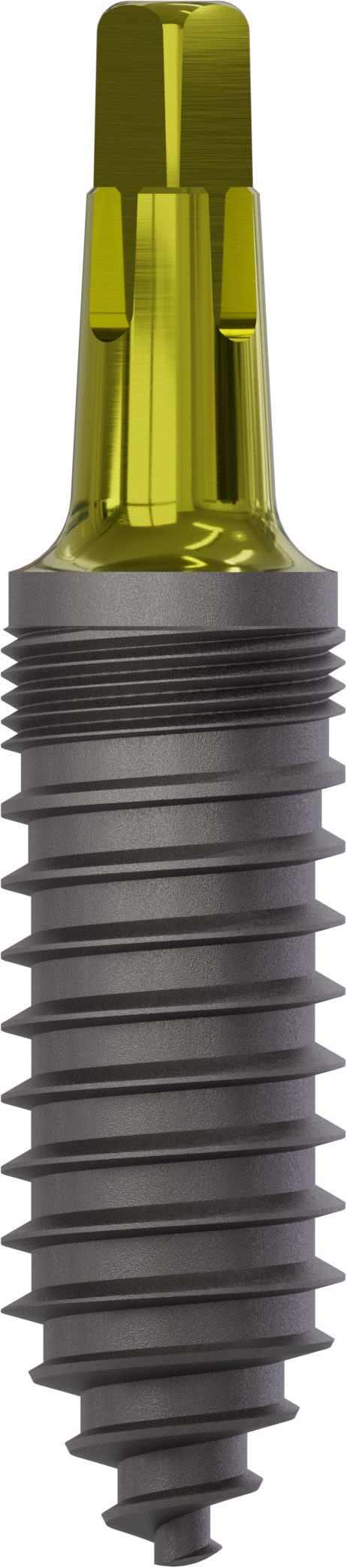 Vierkant-Implantat New Art | ø 5,5 mm | Länge 16,0 mm. Das Champions Vierkant-Implantat ist ein enossales, rotationssymetrisches Implantat aus Titan Grad 4 (KV). Es kann in allen Knochenqualitäten des Ober- und Unterkiefers (D1–D4) mit und ohne Augmentation eingesetzt werden. Durch unterschiedliche Durchmesser und Längen ist ein weit gefächertes Indikationsspektrum gegeben. Sie eignen sich zur Insertion in den bereits langzeitig abgeheilten Kieferknochen (Spätimplantation), zur verzögerten Insertion (6–8 Wochen nach Zahnextraktion) und zur Sofortimplantation (direkt nach Zahnextraktion – unter entsprechenden Bedingungen). Beachten Sie bitte die Indikationseinschränkungen in der jeweiligen Gebrauchsanleitung. Material: Titan Grad 4 (KV)