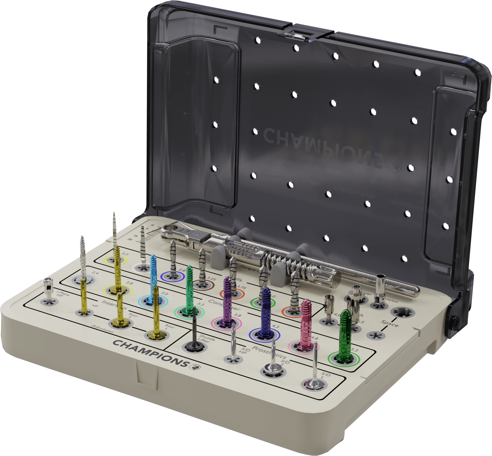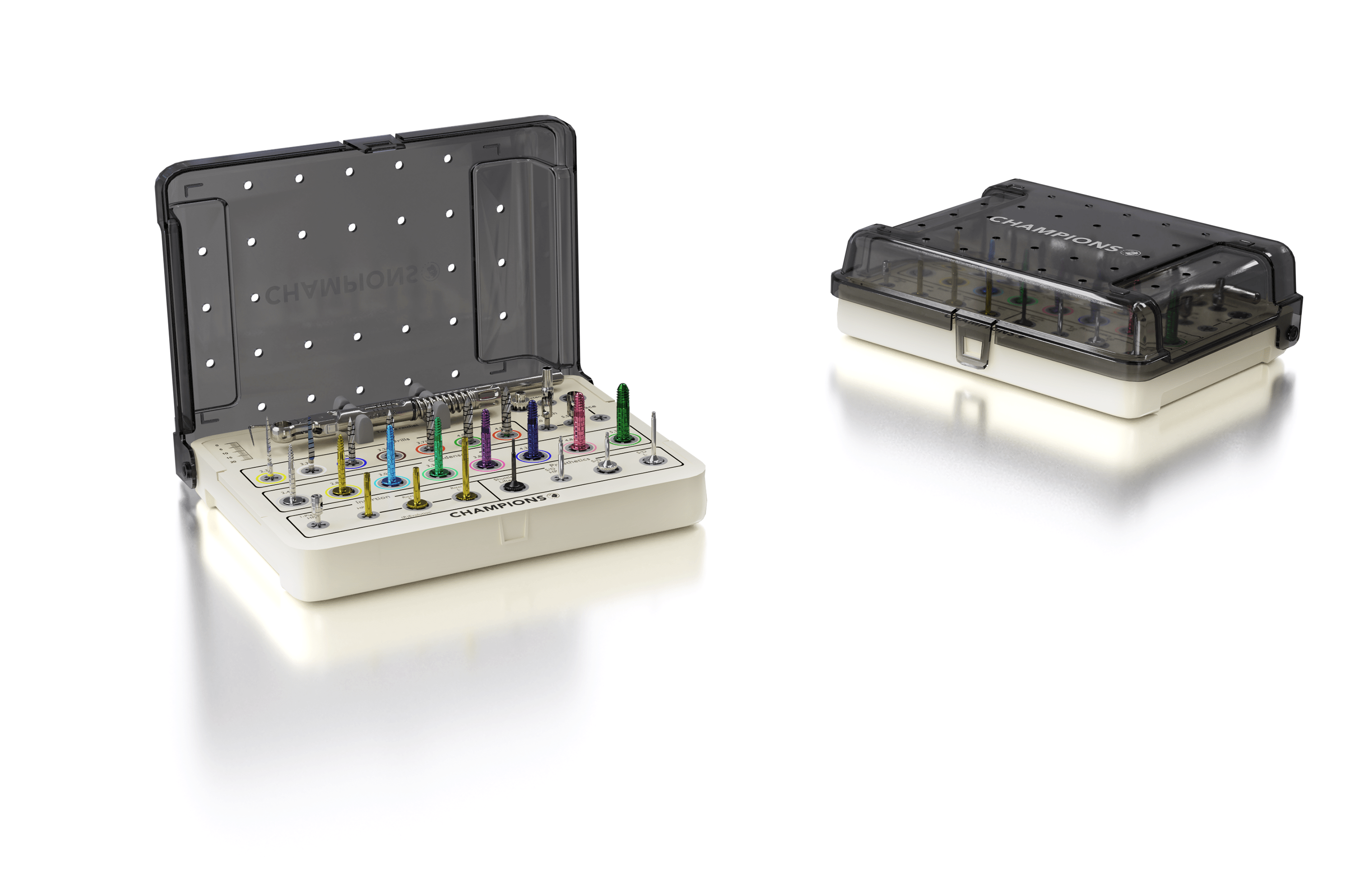 Das OP-Tray enthält sämtliche für die Insertion von CHAMPIONS-Implantaten benötigten Komponenten. Die Farbcodierung oder zusätzlichen Beschriftungen auf dem Inlay erleichtern die Handhabung und Zuordnung der Instrumente nach Gebrauch und Reinigung/Sterilisation.